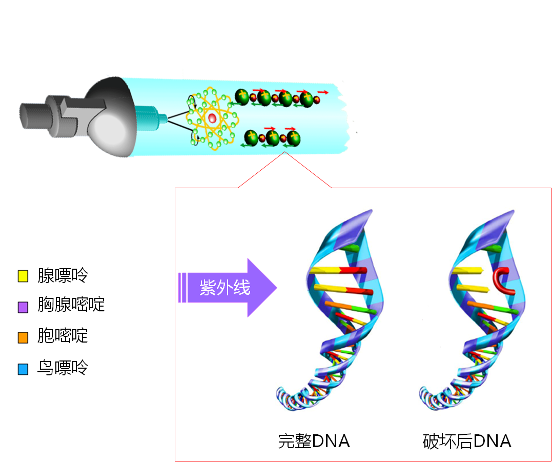 波長介于200~280nm之間,其中240~280nm紫外線為細菌及病毒DNA所吸收,從而破壞細菌及病毒DNA,使其不能復制繁殖。DNA在265nm處具有最大吸收峰。