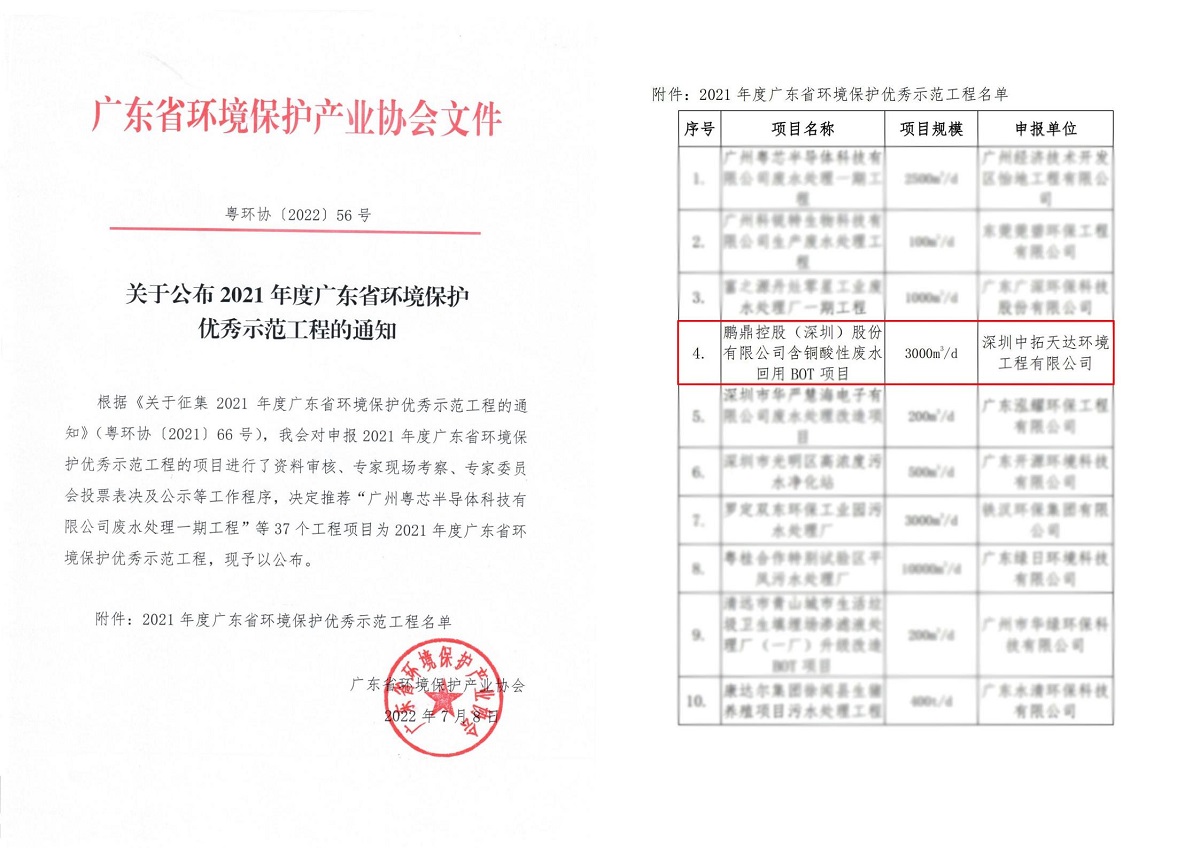 日前,廣東省環境保護產業協會通過資料審核、專家現場考察、專家委員會投票表決等工作程序,評選出入選“2021年度廣東省環境保護優秀示范工程”的37個項目,中拓環境申報的“鵬鼎控股(深圳)股份有限公司含銅酸性廢水回用 BOT 項目”榮登榜單。此次評選活動由廣東省環境保護產業協會發起,是廣東省為大力推進生態文明建設,樹立綠色發展理念,推動形成綠色低碳的宜居灣區而設立的示范類獎項。